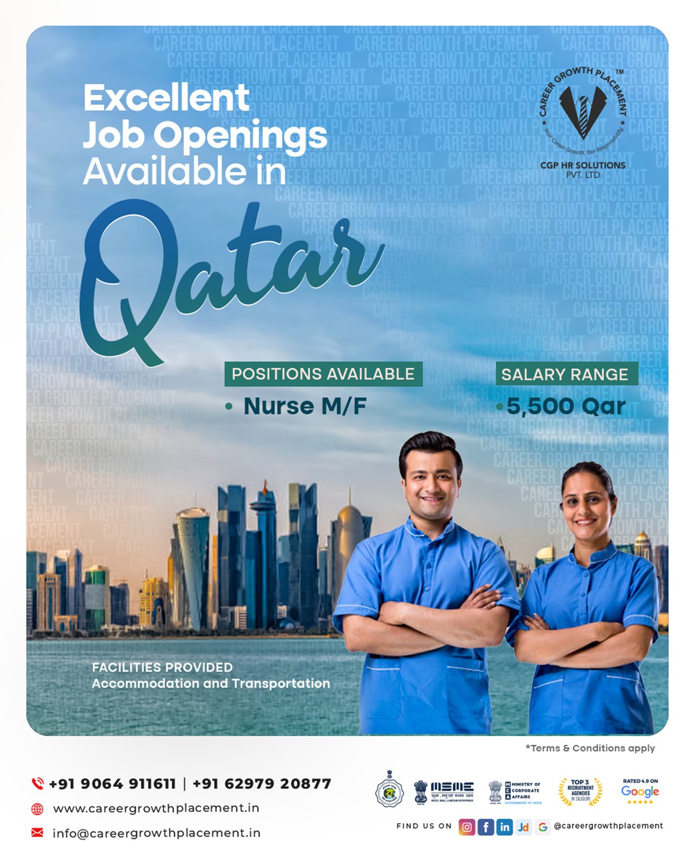 We are hiring qualified and experienced Nurses (Male/Female) for reputed healthcare facilities in Qatar. This is a golden opportunity to build an international nursing career with attractive salary and benefits. Candidates must be passionate about patient care, possess excellent communication skills.
